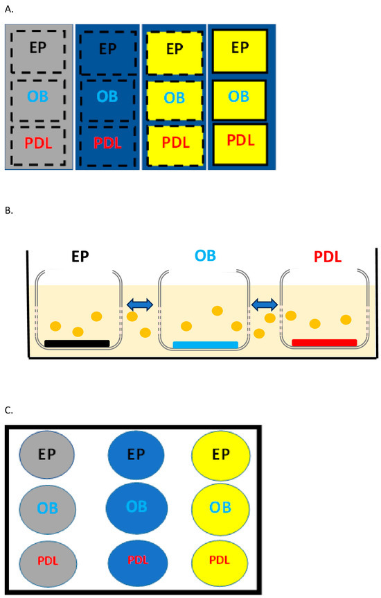 Control plate and experimental plate design. Graphical representation of the experimental plate (CELLBLOKS®) (A). EP: epithelial cell; OB: osteoblast; PDL: periodontal ligament fibroblast; grey color: medium without HA; blue color: medium with diluted HA; yellow color: medium with HA coated on the plate; dashed line: cell blocks with semi-permeable membrane; solid line: cell blocks without semi-permeable membrane. Experimental plate design and cell–cell communication through the semi-permeable membrane (B). Graphical representation of the control plate (C).