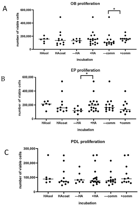 Cell proliferation (number of viable cell/mL) after 3 days of culturing with or without HA and with or without communication. (A) OBs (* p < 0.05); (B) EPs (* p < 0.05); (C) PDL cells. xHA = hyaluronic acid diluted in medium; HAcoat = hyaluronic acid coated on the plate; +HA = hyaluronic acid in medium; −HA = no hyaluronic acid in medium; −comm = culture plate without communication between the different cell types; +comm = cell-block plate with communication between the different cell types.