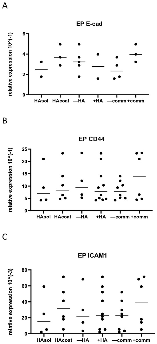 Relative gene expression of EPs after 3 days of culturing with or without HA and with or without communication. (A) E-cad expression; (B) CD44 expression; (C) ICAM1 expression. HAsol = hyaluronic acid diluted in medium; HAcoat = hyaluronic acid coated on the plate; +HA = hyaluronic acid in soluble and coated form; −HA = no hyaluronic acid in medium; −comm = culture plate without communication between the different cell types; +comm = cell-block plate with communication between the different cell types.