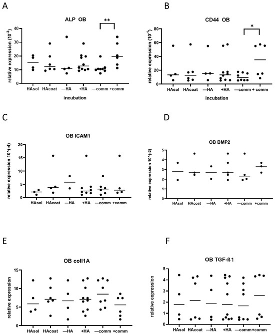 Relative gene expression of OBs after 3 days of culturing with or without HA and with or without communication. (A) ALP expression (** p < 0.01); (B) CD44 expression (* p = 0.08); (C) ICAM1 expression; (D) BMP2 expression; (E) Coll1A expression; (F) TGF-β1 expression. HAsol = hyaluronic acid diluted in medium; HAcoat = hyaluronic acid coated on the plate; +HA = hyaluronic acid in soluble and coated form; −HA = no hyaluronic acid in medium; −comm = culture plate without communication between the different cell types; +comm = cell-block plate with communication between the different cell types.