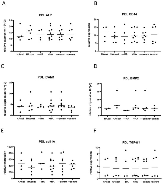 Relative gene expression of PDLs after 3 days of culturing with or without HA and with or without communication. (A) ALP expression; (B) CD44 expression; (C) ICAM1 expression; (D) BMP2 expression; (E) Coll1A expression; (F) TGF-β1 expression. HAsol = hyaluronic acid diluted in medium; HAcoat = hyaluronic acid coated on the plate; +HA = hyaluronic acid in soluble and coated form; −HA = no hyaluronic acid in medium; −comm = culture plate without communication between the different cell types; +comm = cell-block plate with communication between the different cell types.