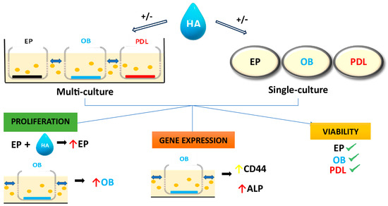 Only single-culture plate in vitro studies have been performed to investigate the effects of HA on osteoblasts, periodontal ligament cells, and epithelium cells. We hypothesize that a multi-culture plate model could mimic the cell–cell interplay among different periodontal cell types and reproduce the cell–HA interaction closer to a real clinical situation compared to a single-culture plate model. This study model may expand our knowledge of the role of HA in periodontal regeneration procedures. Furthermore, we presume, in agreement with the literature [14,27,28], that HA will have a stimulatory effect on the proliferation of osteoblasts and periodontal ligament cells. The aim of this in vitro study is to assess, in single- and multi-culture plate models, the effect of HA on the proliferation, viability, and function of periodontal ligament fibroblasts, osteoblasts, and gingival epithelial cells.