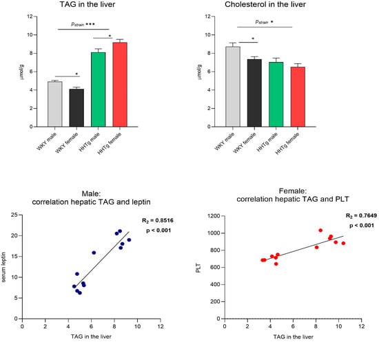 Sex-dependent effects of severe dyslipidemia on hepatic lipids correlated with Wistar–Kyoto control and prediabetic HHTg rats. Data are expressed as the mean ± SEM analyzed using two-way ANOVA and Fisher’s LSD post hoc test; TAG—triglycerides; PLT—platelets; * p < 0.05, *** p < 0.001.