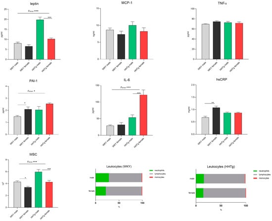 Sex-dependent effects of severe dyslipidemia on systemic inflammatory markers in Wistar–Kyoto control and prediabetic HHTg rats. Data are expressed as the mean ± SEM analyzed using two-way ANOVA and Fisher’s LSD post hoc test; MCP-1—monocyte chemoattractant protein-1; TNFα—tumor necrosis factor alpha; PAI-1—plasminogen activator inhibitor-1; IL-6—interleukin-6; hsCRP—high-sensitivity C-reactive protein; WBC—white blood cells. * p < 0.05, ** p < 0.01, *** p < 0.001.