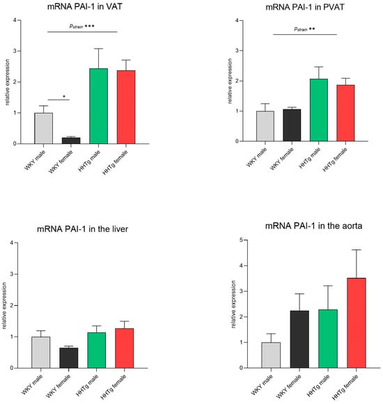 Higher serum PAI-1 concentrations in the HHTg rats were compared with the relative gene expression of PAI-1 in various tissues (Figure 3). While PAI-1 mRNA levels in the liver showed no significant differences, the HHTg rat strain exhibited significantly increased relative gene expression in both VAT (epididymal in males and perimetrial in females) and PVAT (Figure 3). No significant changes in PAI-1 mRNA expression were observed in the aorta.