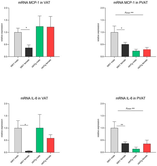 Sex-dependent effects of severe dyslipidemia on the relative gene expression of inflammatory markers in visceral and perivascular adipose tissues in Wistar–Kyoto control and prediabetic HHTg rats. Data are expressed as the mean ± SEM analyzed using two-way ANOVA and Fisher’s LSD post hoc test; MCP-1—monocyte chemoattractant protein-1; IL-6—interleukin-6; VAT—visceral adipose tissue; PVAT—perivascular adipose tissue. * p < 0.05, ** p < 0.01.