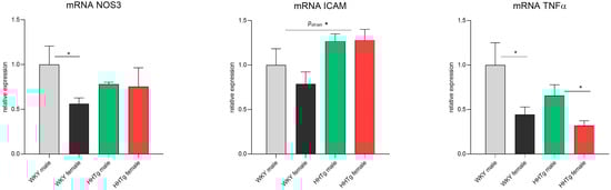 As shown in Figure 5, the HHTg rat strain exhibited significantly increased relative gene expression of intercellular adhesion molecule-1 (ICAM-1) in the aorta compared to the controls. However, no significant differences were observed in the relative gene expression of NOS3 or TNFα between the two strains. In the WKY female rats, decreased mRNA expression of NOS3 was noted, but this effect was not confirmed in the HHTg rat strain. For the inflammatory factor TNFα, the females of both rat strains showed significantly reduced relative mRNA expression compared to age-matched males (Figure 5).