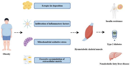 An increasing amount of evidence indicates that obesity can trigger inflammatory responses in skeletal muscle and exert a negative regulatory effect on muscle cell metabolism [6]. In the state of obesity, the elevation of fat content polarizes macrophages in adipose tissue towards the M1 phenotype, augmenting the expression of pro-inflammatory cytokines and adipokines, thereby inducing systemic low-grade inflammation and resulting in the emergence of metabolic syndrome (MS), IR, and T2D [1]. As shown in Figure 2, although obese adipose tissue compensates by altering the volume (hypertrophy) and number (hyperplasia) of adipocytes, its fat-storing capacity is limited. Excessive energy intake by the body leads to the overproduction of free fatty acids [10], causing abnormal lipid deposition in tissues, such as the liver, skeletal muscle, and heart, and instigating chronic tissue inflammation [6,7,11]. When lipids and their derivatives are deposited within the muscle, the capacity for cellular mitochondrial β-oxidation is impaired with an increase in reactive oxygen species production to create a lipotoxic environment and concurrently the secretion of some pro-inflammatory myokines is enhanced [8]. At this point, skeletal muscle, which is responsible for processing the majority of glucose, experiences metabolic dysregulation, thereby influencing whole-body homeostasis.