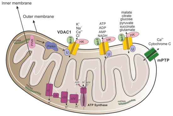 - Belosludtseva, N.V.; Dubinin, M.V.; Belosludtsev, K.N. Pore-Forming VDAC Proteins of the Outer Mitochondrial Membrane: Regulation and Pathophysiological Role. Biochemistry 2024, 89, 1061–1078. [Google Scholar] [CrossRef]