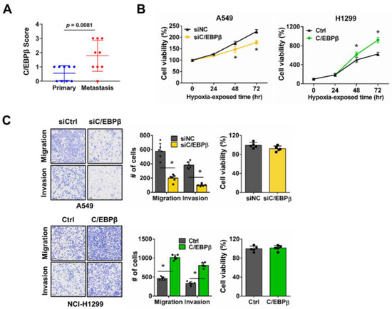 Figure 1. CCAAT/enhancer-binding protein β (C/EBPβ) regulates non-small-cell lung cancer (NSCLC) cell proliferation, migration, and invasion under hypoxic conditions: (A) Immunohistochemistry (IHC) score for C/EBPβ between the primary and matched metastatic tumors. Data are presented as the mean ± SD. Statistical significance was determined using the t-test (p = 0.0081). Power analysis was performed using G*Power software. The analysis confirmed that the sample size was sufficient to detect the observed effect size (Cohen’s d = −1.42) with a significance level (α) of 0.05 and a power (1 − β) of 0.8096. Power (1 − β) represents the probability of rejecting a false null hypothesis. (B) Cell proliferation was evaluated at 24 h intervals under hypoxic conditions. Data are presented as the mean ± SD from independent experiments performed in triplicate. * p < 0.05 vs. each control. (C) Trans-well migration and invasion assays were performed under hypoxic conditions using the A549 (top) and NCI-H1299 (bottom) cell lines. Scale bar, 100 μm. Cell proliferation assays were conducted under the same conditions as those used for the trans-well assay. Data are presented as the mean ± SD from three independent experiments. * p < 0.05 vs. each control.
