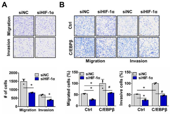Figure 3. HIF-1α regulates C/EBPβ-induced migration and invasion of NSCLC cells in hypoxia. (A,B) Effects of HIF-1α downregulation on migration and invasion were evaluated in A549 and H1299-Tet-C/EBPβ cells using a tans-well assay: (A) A549 cells were exposed to hypoxic conditions for 24 h. (B) NCI-H1299 cells were maintained under hypoxic conditions for 16 h. Data are presented as the mean ± SD from three independent experiments. Scale bar, 100 μm. * p < 0.05 vs. each control, # p < 0.05 vs. C/EBPβ with siNC in NCI-H1299.