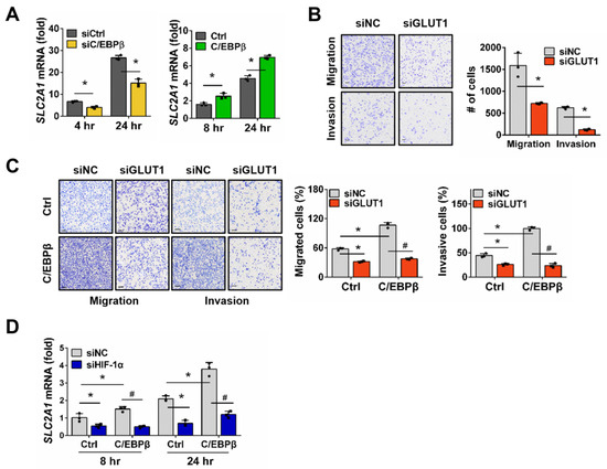 Figure 4. Migration and invasion of NSCLC cells are increased through the C/EBPβ-HIF-1α- Glucose transporter 1 (GLUT1) axis under hypoxic conditions: (A) Solute carrier family 2, facilitated glucose transporter member (SLC2A1) mRNA levels were measured using RT-qPCR in C/EBPβ-silenced A549 and H1299-Tet-C/EBPβ cells after exposure to hypoxic conditions for the specific periods. Data are presented as the mean ± SD from three independent experiments. * p < 0.05 vs. each control (B,C) The impact of SLC2A1 downregulation on migration and invasion was assessed in A549 and H1299-Tet-C/EBPβ cells using the trans-well assay, following the same experimental methodology described in Figure 3A,B. Data are presented as the mean ± SD from three independent experiments. Scale bar, 100 μm. * p < 0.05 vs. each control, # p < 0.05 vs. C/EBPβ with siNC in NCI-H1299. (D) mRNA levels of SLC2A1 were quantified using RT-qPCR. H1299-Tet-C/EBPβ cells were transfected with siNC or siHIF-1α and exposed to hypoxia for the specified durations. Data are presented as the mean ± SD from three independent experiments. * p < 0.05 vs. control at each group; # p < 0.05 vs. C/EBPβ with siNC at each time.