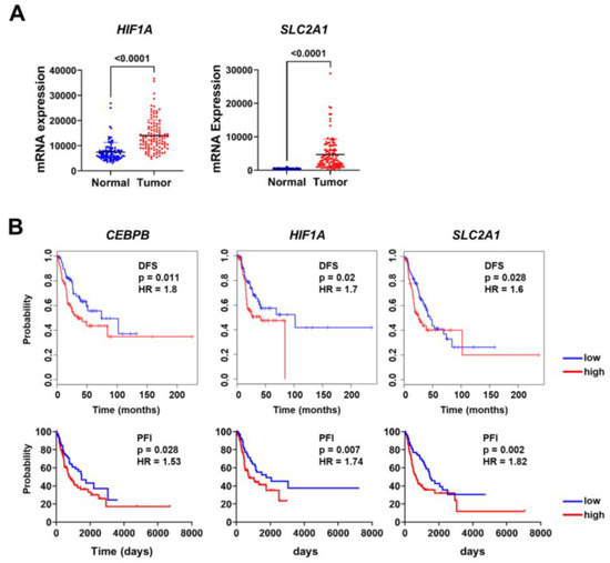 Additionally, survival analysis was performed to confirm the relationship between the expression levels of CEBPB, HIF1A, and SLC2A1 and clinical outcomes. Using the TCGA dataset, we analyzed both disease-free survival (DFS) and progression-free interval (PFI). Patients with higher CEBPB, HIF1A, and SLC2A1 showed shorter DFS and PFI, suggesting a potential association between elevated CEBPB, HIF1A, and SLC2A1 expression and less favorable outcomes (Figure 5B). Previous studies have reported SLC2A1 as a prognostic marker in various cancers, including NSCLC [39,41,42]. Building on this knowledge, our study investigates the mechanistic regulation of SLC2A1 via the C/EBPβ-HIF-1α axis under hypoxic conditions. These findings provide additional context for the relevance of C/EBPβ in NSCLC.