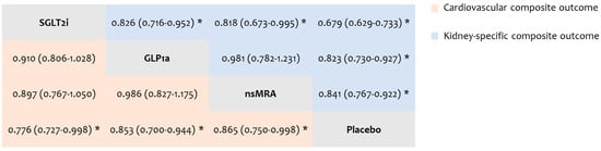 Figure 1. League table comparing interventions for the risk of the cardiovascular composite (lower half) and kidney-specific composite (upper half) outcome. Each cell presents the relative effects of interventions as hazard ratios with 95% confidence intervals. Statistically significant differences are indicated by asterisks.