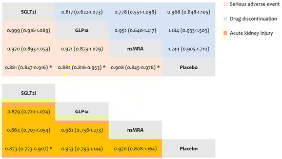 Figure 2. League tables comparing interventions for the risk of serious adverse events, adverse events leading to drug discontinuation, and acute kidney injury. Each cell presents the relative effects of interventions as hazard ratios with 95% confidence intervals. Statistically significant differences are indicated by asterisks.