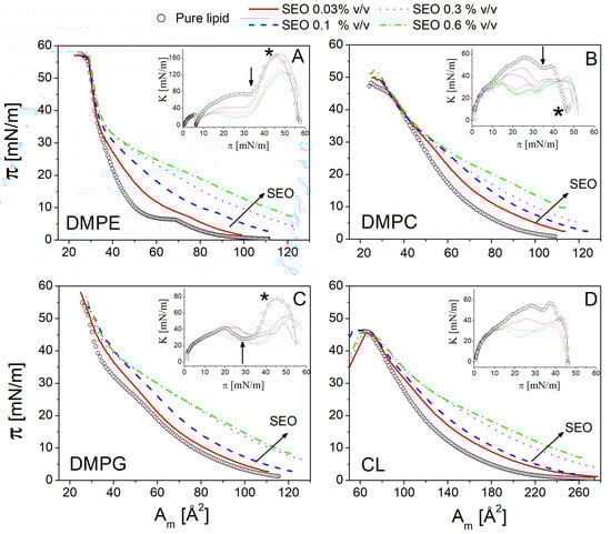To further elucidate the film behaviour, the surface compressional modulus K of the monolayers was calculated according to Equation (2) (inset of Figure 2A). This parameter provides complementary information on the variation of the thermodynamic and structural properties of the monolayer. As expected, for a pure DMPE monolayer, this parameter becomes vanishingly small at the LE-LC transition, at a surface pressure close to 7 mN/m. Then it progressively increases until an abrupt variation occurs in correspondence with the LC-S transition (see the arrow in the inset of Figure 2A), reaching its maximum value where the collapse emerges, before declining again. In the presence of SEO, the values of K decrease regularly in all thermodynamic phases of the monolayer, as a consequence of the weakening of lipid packing caused by SEO, evidencing a “fluidifying” effect. The overall fluidization of the monolayer is further reflected in the continuous decrease of the absolute maximum of K with increasing SEO content [31,36]. A similar decrease in values of K for lipid monolayers has been reported in the literature for other essential oils and drug–lipid mixed films [37].