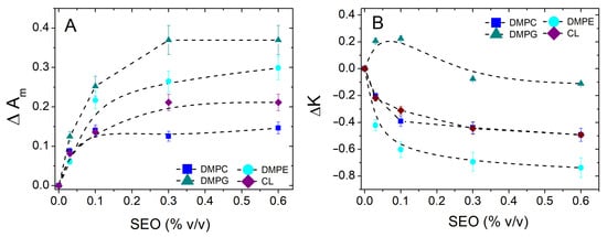 To provide an overview and compare the effect of SEO on the different monolayers, for all the isotherms shown in Figure 2, we extrapolated the molecular area at = 30 mN/m, i.e., the surface pressure mimicking the cell membrane packing, and calculated its relative variation as , where is the area in the absence of SEO. By a similar definition, we also calculated the relative variation in surface compression modulus K at the same target pressure. The results are shown in Figure 3, panels A and B, respectively. The positive increment of provides immediate evidence of the presence of SEO at the interface, indicating its insertion into the film and perturbation of molecular packing, regardless of the nature of the lipid. A concentration-dependent effect, with distinct features for each lipid, is always observed. The largest effect is observed for DMPG. Saturation occurs above 0.3% v/v for most lipids, except for DMPC, where it appears even at lower concentrations (0.1% v/v). In general, the presence of saturation can be intuitively explained by considering that the perturbation caused by the injection of a certain number of molecules can create voids and vacancies, which can then accommodate a larger amount of SEO, so the perturbation does not increase further. Another possibility is that at higher SEO concentrations, the localization of SEO molecules shifts towards the region of hydrophobic carbon chains, to which SEO has a higher affinity, thereby reducing the effect of interfacial disturbance. This hypothesis is consistent with the regular behaviour of isotherms with increasing amounts of SEO and with the observed superimposition of the curves at higher SEO concentrations.