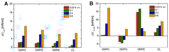 Increment in the surface pressure after injection of SEO under monolayers at surface pressures 0 mN/m (A) and 30 mN/m (B), for all the investigated lipids at the SEO concentrations, as indicated in the legend.