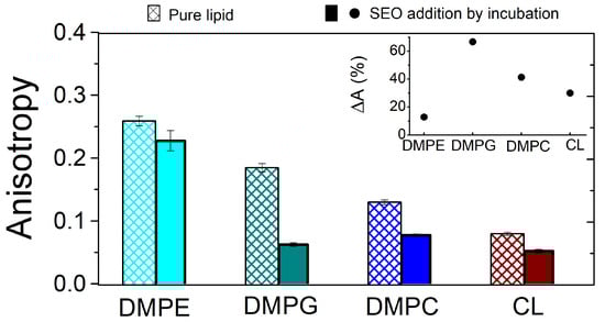 Values of fluorescence anisotropy at 20 C for DMPE, DMPG, DMPG, and CL lipid membranes in the absence (striped bars) and after (full bars) interaction with SEO, with SEO dissolved in the organic solvent with the lipid, in the initial step (film formation) of vesicle preparation. The inset shows the percentage change of anisotropy .
