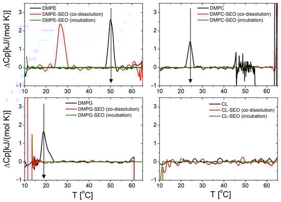 Excess molar heat capacity for pure DMPE, DMPC, DMPG, and CL lipid membranes, and in the presence of SEO, added during membrane formation by co-dissolution in the organic solvent and on already formed vesicles, by incubation in the vesicle suspension (see legend). Vertical arrows mark the lipid transition temperature.