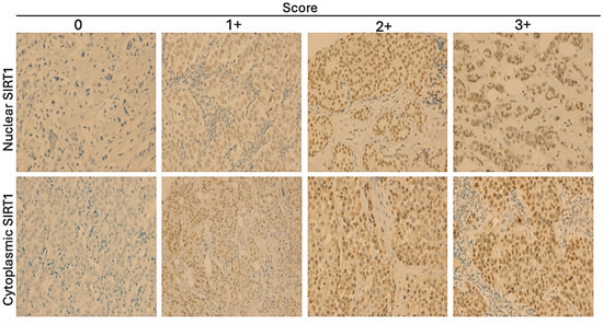 Figure 1. Representative cases of IHC staining of SIRT1 ranging from no expression (0) to high expression (3+) on BC samples (10× magnification). The first row shows nuclear SIRT1 expression, and the second row shows cytoplasmic SIRT1 expression.