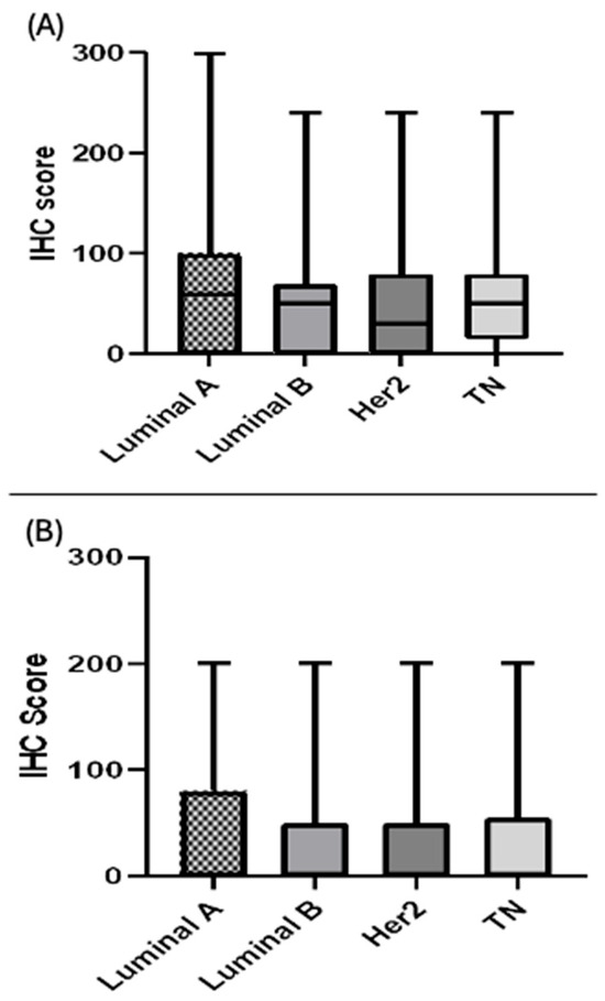 22. Huszno, J.; Kolosza, Z. Molecular characteristics of breast cancer according to clinicopathological factors. Mol. Clin. Oncol. 2019, 11, 192–200. [Google Scholar] [CrossRef] [PubMed]