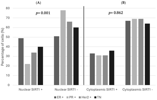 Figure 4. Distribution of nuclear and cytoplasmic SIRT1 expression in relation to receptor status of BC: (A) nuclear SIRT1 protein expression and (B) cytoplasmic SIRT1 protein expression. (SIRT−): low expression (<mean); and (SIRT+): high expression (>mean).