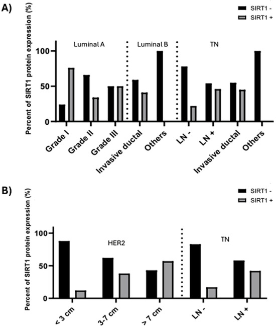 Nuclear SIRT1 expression was examined in relation to the patients’ clinicopathological features for each intrinsic subtype. Our data showed (Table 4) that the SIRT1 protein was significantly associated with luminal A and TN BC. In luminal A, the level of expression of SIRT1 varied between different tumor grades (p < 0.001). Higher SIRT1 expression was observed mainly in 76% of grade I, 34% of grade II, and 50% of grade III carcinomas. These results support the notion that SIRT1 overexpression is observed mainly in low-grade tumors. However, the higher expression of SIRT1 in the TN type was associated with lymph node metastasis (p = 0.048) (Figure 5A). Nuclear SIRT1 protein expression was shown to be an independent predictive variable in multivariate logistic regression analyses in luminal A BC (p = 0.029, odds ratio [OR] of 0.313 confidence interval (CI) 0.890 (upper)–0.110 (lower)) but not in TNBC (p = 0.053, odds ratio [OR] of 3.130 CI 9.965 (upper)–0.983 (lower)).