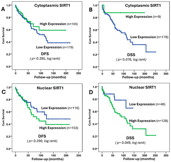 Figure 6. Kaplan–Meier survival curves showing both disease-free survival (DFS) and disease-specific survival (DSS) for cytoplasmic (A,B) and nuclear (C,D) SIRT1 protein expression.