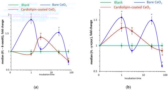 | DNA double-strand breaks (phos-γH2AX protein) | ↑ | 0 | ↓ |