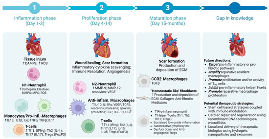 Schematic showing time course for the activation and trafficking of different immune cells into the heart post-MI and some key areas that need further exploration to clinically translate immuno-modulation strategies to ameliorate tissue fibrosis (Created in BioRender. McKenna, D. (2024); https://BioRender.com/d21o756, accessed on 18 December 2024).