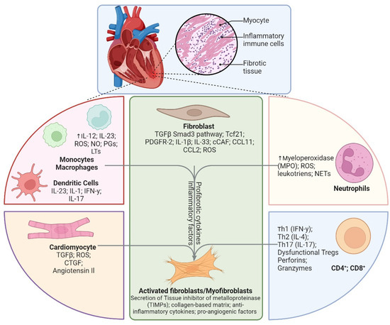Schematic showing multi-factorial interactions between cardiomyocytes and different immune cells in mediating fibroblast activation (Created in BioRender. McKenna, D. (2024); https://BioRender.com/d21o756, accessed on 18 December 2024).