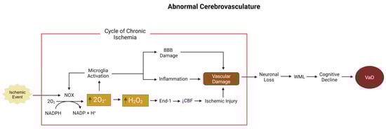 Summary of superoxide contributions to vascular dementia in abnormal cerebrovasculature. An ischemic event can lead to the upregulation of NOX enzymes and the production of superoxide (O2−) and hydrogen peroxide (H2O2). O2− can promote inflammation and BBB damage. H2O2 can prolong the ischemic state, leading to further injury. Ultimately, the damage induced by O2− and H2O2 leads to VaD.