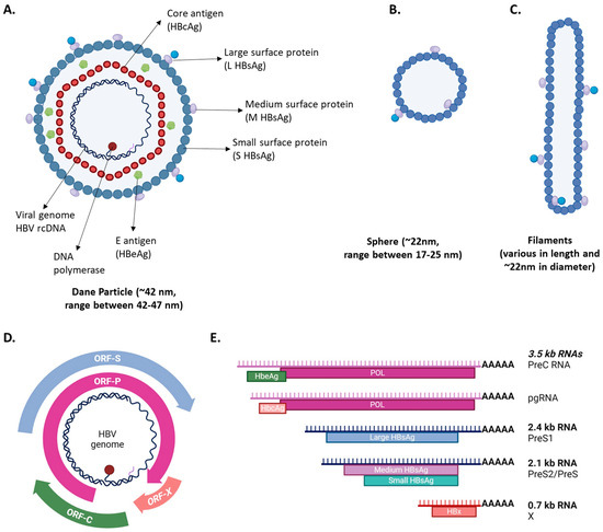 Schematic representation of (A) infectious HBV particles (Dane particles) and non-infectious (B) sphere and (C) filament subviral particles. Schematic HBV genome organization and open reading frames (ORFs) (D). (E) shows the HBV RNAs encoded from HBV cccDNA and the proteins (underneath the RNA molecules) produced from these RNAs. Common names of the RNAs and their lengths are shown on the right. Created in BioRender, Sari G., 2024 (BioRender.com).