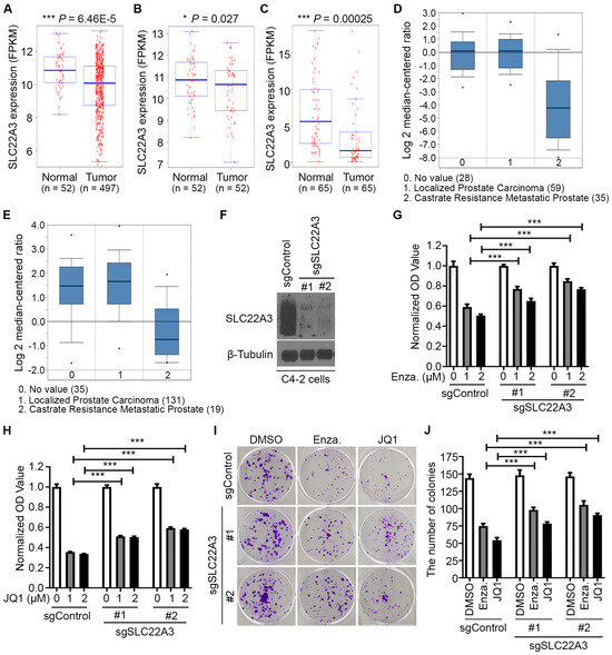 The SLC22A3 expression is highly downregulated in prostate cancer tissues and negatively related to drug efficacy. (A,B) The SLC22A3 transcription level was compared between prostate normal and cancer tissues from the TCGA patient dataset [27] (A) and between paired prostate normal and cancer tissues from the TCGA patient dataset [27] (B). (C) The SLC22A3 transcription level was compared in patients between paired normal prostate tissues and cancer tissues from a previous study [29]. (D,E) The SLC22A3 transcription level was compared in patients among non-localized and metastatic prostate tissues from a previous study [30]. (F–H) The SLC22A3 was knocked out with two sgRNA constructs (#1 and #2) individually in C4-2 cells to detect the SLC22A3 protein level by Western blot analysis in (F), and drug treatment in (G,H). (I,J) Two sgSLC22A3 knockout cell lines (#1 and #2) were treated with JQ1 (2 µM) and Enzalutamide (2 µM) for clonogenic survival assay. The representative images are shown in (I) with quantification data in (J). Original images of (F) can be found in supplementary Figure S3. The following symbols were used to denote statistical significance: * p < 0.05, *** p < 0.001.