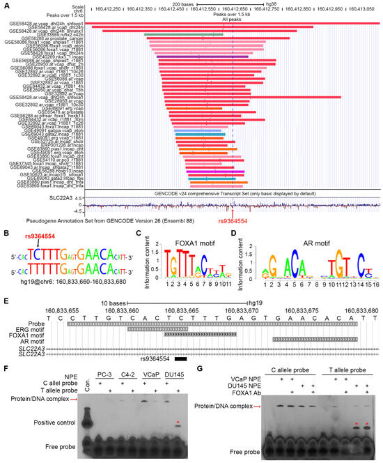 The SNP rs9364554 is manipulated by prostate cancer-specific TFs. (A) The online public datasets [33,36,37,38,39,40,41,42,43,44,45,46] reveal that SNP rs9364554 containing a DNA sequence is favorable by multiple prostate cancer-specific TFs (A). (B–D) The DNA sequence containing SNP rs9364554 (B) is overlapped with prostate cancer-specific TFs, such as FOXA1 (C) and AR (D). (E–G) The probe containing SNP rs9364554 (E) was designed to perform EMSA with 1 µg of nuclear protein extracts from four prostate cancer cell lines (PC-3, C4-2, VCaP and DU145) (F). The FOXA1 antibody was added to the reactions, which was followed by EMSA (G). The red “*” indicates a DNA/protein complex that might contain FOXA1 mutant protein. Original images of (F,G) can be found in supplementary Figure S3.
