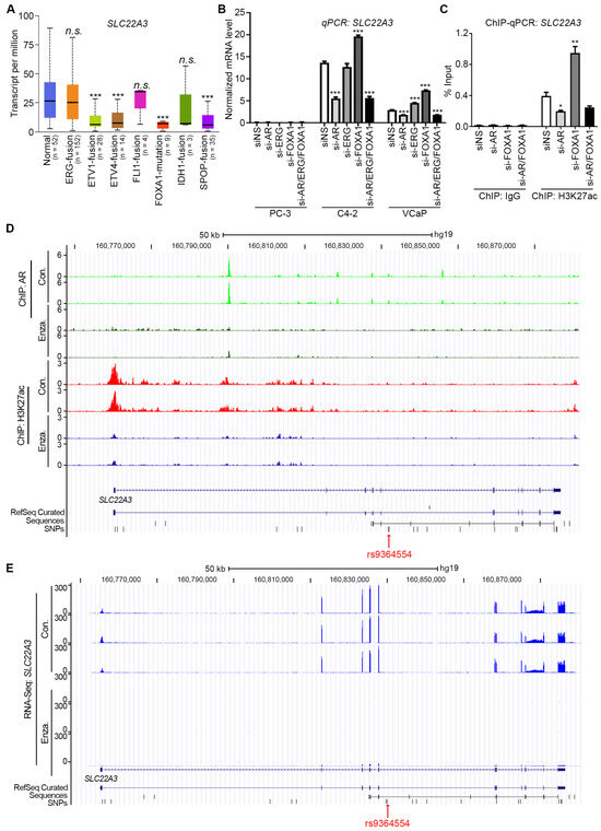 The SLC22A3 transcription is negatively manipulated by FOXA1 while positively regulated by AR. (A) The transcription level of SLC22A3 was analyzed according to molecular signature from TCGA datasets with online software (accessed on 21 December 2021, https://ualcan.path.uab.edu/). (B,C) The C4-2 cells were knocked down with the indicated TFs with siRNA, which was followed by qPCR to detect the mRNA level of SLC22A3 (B) and ChIP-qPCR to examine the enrichment of H3K27ac at the SLC22A3 promoter (C). (D) UCSC tracks from published datasets [48] show profiles of ChIP-seq signals of AR and H3K27ac in C4-2 cells. (E) UCSC tracks from published datasets [48] show profiles of RNA-seq signals of SLC22A3 after Enzalutamide treatment in C4-2 cells. The following symbols were used to denote statistical significance: n.s., not significant, * p < 0.05, ** p < 0.01, *** p < 0.001.