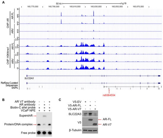 The AR variants undermine SLC22A3 expression. (A) UCSC tracks from published datasets [47] show profiles of ChIP-seq signals of AR and H3K4me1 in AR FL and ARV-overexpressing cell lines. (B) VCaP nuclear protein extracts were incubated with biotin-labeled C allele, followed by the addition of 0.5 µg of AR or AR variant 7 antibody. The reactions were loaded to 6% of polyacrylamide DNA gel for EMSA assay. (C) The C4-2 cells were transfected with AR-FL or -V7 for 48 h and harvested for Western blot to detect the SLC22A3 protein level. Original images of (B,C) can be found in supplementary Figure S3.