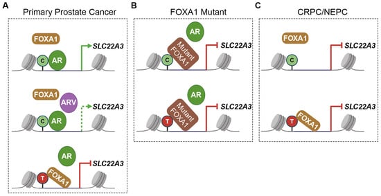 A working model to elucidate the interplay between FOXA1 and AR in regulating SLC22A3 transcription through SNP rs9364554. (A) Specifically, in primary prostate cancer, SLC22A3 is upregulated in AR FL-expressing cells but diminished in ARV-expressing cells in a background of C allele SNP rs9364554. However, in a background of T allele SNP rs9364554, FOXA1 competes AR in binding this site and undermines SLC22A3 transcription. (B) The mutations of FOXA1 enhance its binding affinity to either the C or T allele, resulting in the suppression of AR target gene expression. (C) In CRPC or NEPC patients, the lack of AR expression impairs SLC22A3 expression.