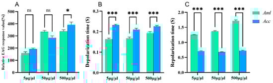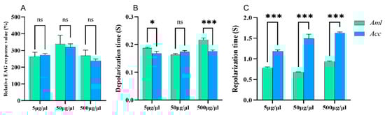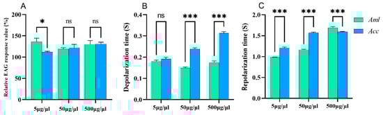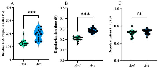 The EAG response characteristics of A. m. ligustica (Aml) and A. c. cerana (Acc) to the VOCs of V. destructor. (A) Relative EAG response value, (B) depolarization times, and (C) repolarization times between Aml and Acc. *** Indicates p < 0.001; ns indicates no statistical difference.