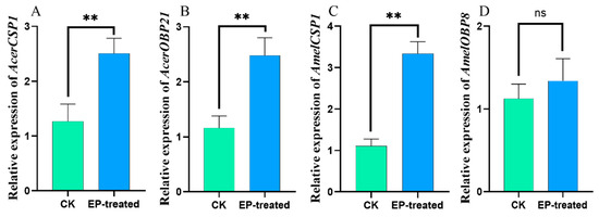 The effect of exposure to ethyl palmitate on the expression levels of (A) AcerCSP1, (B) AcerOBP21, (C) AmelCSP1, and (D) AmelOBP8. ** Indicates p < 0.01; ns indicates no statistical difference.