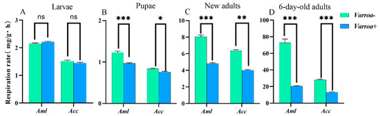 The respiratory metabolic intensity of bees at different ages. (A) The respiratory metabolic intensity of 6-day-old larvae. (B) The respiratory metabolic intensity of 4-day-old pupae. (C) The respiratory metabolic intensity of a 1-day-old worker. (D) The respiratory metabolic intensity of a 6-day-old worker. * Indicates p < 0.05; ** indicates p < 0.01; *** indicates p < 0.001; ns indicates no statistical difference.