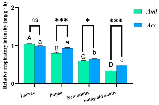 Relative respiratory metabolic intensity of bees at different ages. Identical letters indicate no significant difference (p > 0.05), and different letters represent significant differences (p < 0.05). To clarify, capital letters (A, B, C, and D) used for comparisons of different development stages in Aml, while lowercase letters (a, b, and c) used for those in Acc. * Indicates p < 0.05; *** indicates p < 0.001; ns indicates no statistical difference.