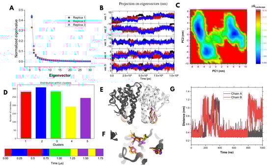 MD simulations showed consistent behaviors across trajectories; the Root Mean Square Deviations (RMSD) values ranged from 0.18 to 0.25 nm relative to the initial structure (Supplementary Material Figure S2A), the radii of gyration from 2.16 to 2.22 nm (Figure S2B), and with similar Root Mean Square Fluctuations (RMSF) profiles (Figure S2C,D). Principal Component Analysis (PCA) [43,44,45,46] indicated non-linearity in eigenvector 5 across replicates (Figure 2A), with the first five components explaining 54.2%, 53.4%, and 51.1% of the variance in replicates 1, 2, and 3, respectively. The temporal projection of eigenvalues (Figure 2B) revealed a dynamic convergence across trajectories.