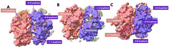 SILCS results from the three replicas (A–C) performed with the solvated model in a mixed solvent of 0.2 M isopropanol/H2O. The regions with the highest occupation density of the probe and the estimation of the free energy grid of the points classified as critical according to our methodology are shown.