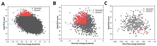 Virtual screening process. (A) Relaxed screening of the complete compound library; (B) exhaustive screening of the top results; and (C) screening on human mu-class GST structures (HGSTM).
