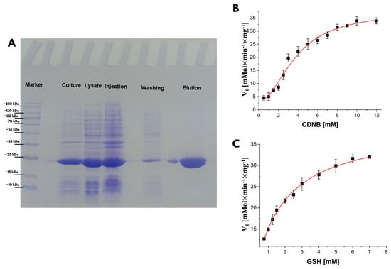 Results of the purification and enzymatic activity of recombinant Ts25GST. (A) PAGE-SDS of the recombinant protein. (B) Enzyme kinetics with variable CDNB. (C) Enzyme kinetics with variable GSH.