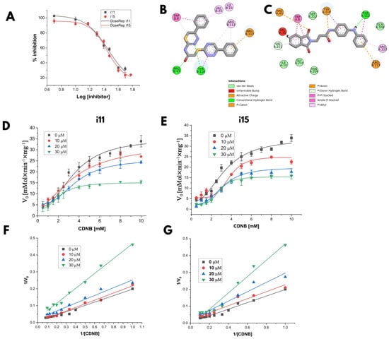Experimental results of inhibitor characterization. (A) Dose–response curve for IC50 calculation. (B,C) Two-dimensional diagrams of the interaction between i11 and i15 with chain A of the Ts25GST model, respectively. Effect of the concentration of inhibitors i11 (D) and i15 (E) on the kinetic parameters of recombinant Ts25GST for CDNB variation. Double reciprocal plots for the reaction rates with different concentrations of CDNB and in the presence of different concentrations of inhibitors i11 (F) and i15 (G).