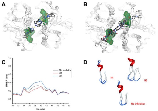 Superposition of conformations of the energy minima from the Ts25GST-GSH simulations in complex with 2 molecules of i11 (A) and i15 (B). Results of RMSF calculations (C). Analysis of the effect of the inhibitors on the mobility of the mu loop (D).