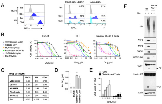 Btz selectively targets CTCL cells over normal CD4+ T cells. (A) (Left) Cell surface CD4 expression was measured by flow cytometry in Hut78 and HH CTCL cells. (Right) Non-malignant CD4+ T cells were isolated from PBMCs from normal human donors, which are a mixture of CD4+ and CD8+ T-cell populations. Flow cytometry data are shown for CD8- and CD4-stained cells. (B) Hut78, HH, and normal CD4+ T cells were treated with dose ranges of the indicated ER stress-inducing drugs for 48 h. Cell viability data are shown. (C) Effective concentration 50 (EC50) values were extrapolated from dose curves shown in (B). EC50 values are shown in μM. (D) Effective concentration 50 (EC50) values were extrapolated from Btz dose curves representing 2–3 experiments for each of the indicated cell lines. CD4+ T cells from 2 different human donors are shown. Statistical significance was determined using Student’s t-test (* p < 0.05, N = 3). (E) Hut78 CTCL cells and normal CD4+ T cells were treated with the indicated concentrations of Btz for 24 h. Flow cytometry data for cleaved caspase-3 positive cells are shown (mean ± SEM, N = 3). (F) HH and normal CD4+ T cells were treated with Btz (20 nM) for 16 h. Western blot analysis of the indicated UPR and apoptotic markers is shown.